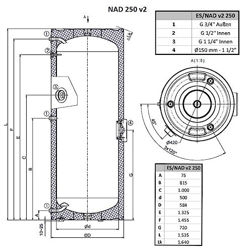 250 Liter Standspeicher mit Isolierung und emaillierter Innenfläche, ohne Wärmetauscher. Bodenstehend, max. 6,0 kW Einbaulauf, Aufnahme für 1 1/2″ Heizelement, Druckfest bis 3 bar.