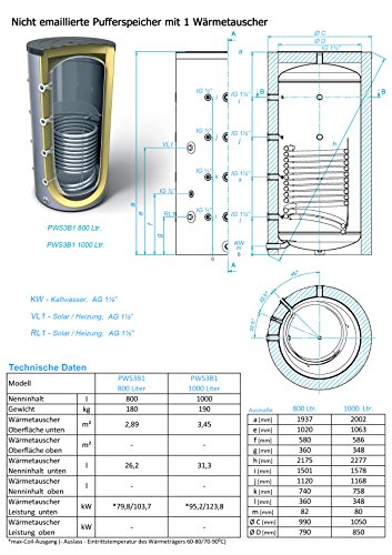 800L Pufferspeicher/ Heizungsspeicher- Warmwasserspeicher für Heizungswasser, mit 1 Wärmetauscher (auch als Solarspeicher geeignet), inkl. Isolierung. Für Trinkwasser siehe emaillierte EWS8B Reihe