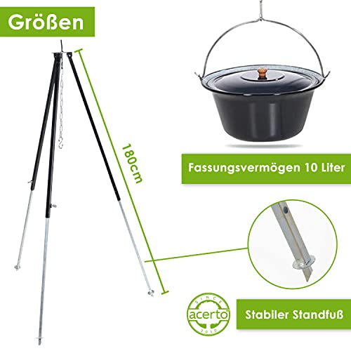 acerto 31794 Ungarischer Gulaschkessel (10 Liter) + Dreibein- Gestell (180cm) + Feuerschale (80cm) + Kaminholz Buche | Teleskop- Dreifuß mit Gulasch- Topf Suppentopf Glühweintopf