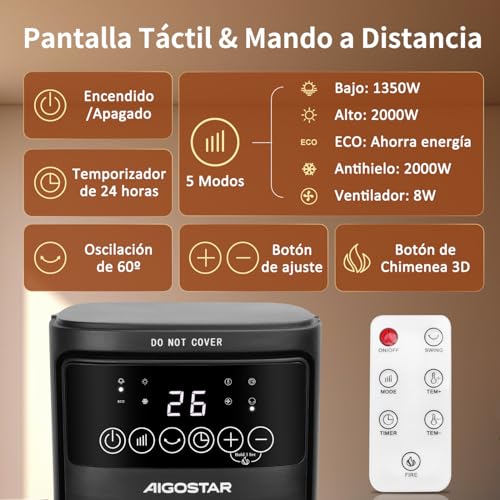 Aigostar Ayden- Heizlüfter mit Fernbedienung, LED Touch, Schnellheizer mit 3D Flamme, 2000W, 5 Modi & ECO, Leise, Einstellbare Temperatur 5- 35℃, 24H Timer, Oszillation, Schwarz