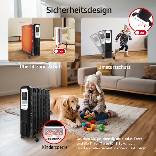 Aigostar Oil Monster 33JHH- 2500W Ölradiator Energiesparender, LCD Elektro Heizkörper mit 13 Rippen, 4 Heizstufen, Thermostat, Fernbedienung, Überhitzungsschutz, Elektroradiator Elektro Heizung