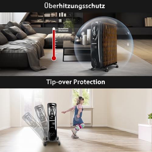 Leistung 1500 W, ermöglicht Heizen von ca. 12–16 m². 7 Elemente für effiziente Wärmeverteilung. Drei Leistungsstufen und regelbarer Thermostat. Design von Aigostar, geprüfte Qualität.