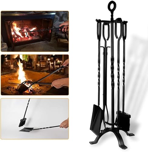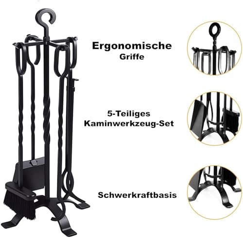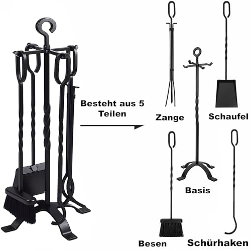 AMAGABELI 26″(66cm) 5- teilige Kaminbesteck Set Kamingarnitur mit Schmiedeeisen und Innenausstattung Kaminzubehör Kaminständer Feuerzange Schaufel Antikbürste Schornsteinschürhaken Schwarz