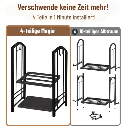 Das Amagabeli Kaminholzregal bietet stabilen Stauraum für Brennholz und praktisches Zubehör – ideal für Innen- und Außenbereiche. Mit den Maßen 74 cm x 40 cm x 30 cm sorgt das Regal dafür, dass Brennholz ordentlich gestapelt wird und die Luft zirkulieren kann, damit es trocken bleibt. Eine 5 cm erhöhte Bodenplatte ermöglicht Winddurchzug und verhindert Feuchtigkeit. Zum Lieferumfang gehören vier Kaminwerkzeuge (Schaufel, Bürste, Zange, Schürhaken) sowie eine Stahlablage unter dem Regal, auf der brandsicher Anzünder oder weiteres Zubehör Platz finden. Die robuste Bauweise aus pulverbeschichtetem Stahl macht das Regal langlebig und pflegeleicht und eignet sich sowohl für den Innenbereich als auch für geschützte Außenbereiche. Die einfache Montage erfolgt durch das Anbringen der Mittelrahmen an den Seiten; danach hängen Sie Haken sowie Kaminwerkzeuge ein. Das zeitlose, klassische Design fügt sich stilvoll in Wohn- oder Outdoor-Bereich ein und schafft eine ansprechende, funktionale Feuerstelle. Bestellen Sie dieses Set und profitieren Sie von organisiertem Brennholz, praktischem Zubehör und einem eleganten Erscheinungsbild.