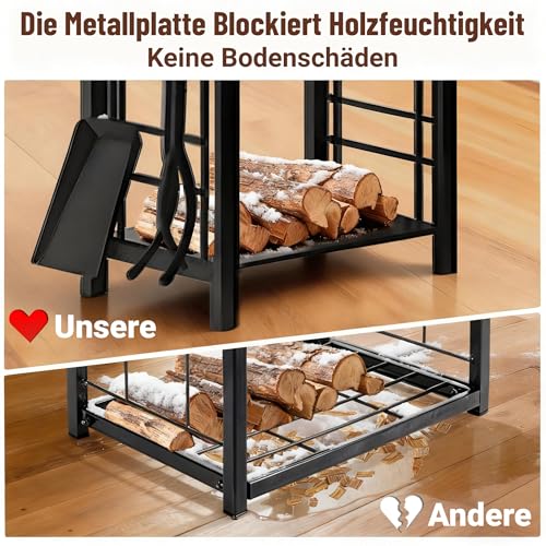 Amagabeli Kaminholzregal Innen Brennholzregal mit 4 Kaminwerkzeug 74x40x30cm Kaminholzständer Kaminbesteck für Außen Kaminholzhalter Holzregal für Kamin Kaminofen Besteck Schmiedeeisen Schwarz
