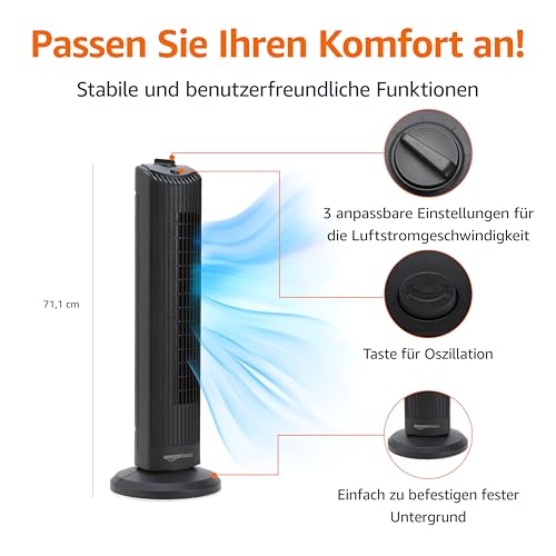 Amazon Basics Oszillierender Turmventilator 71 cm mit 60- Grad- Winkel für Schlafzimmer, Wohnzimmer, Büro, 3 Geschwindigkeiten, Intuitive Mechanische Steuerung, Mattschwarz, 35W, 71 cm x 24 cm x 24 cm
