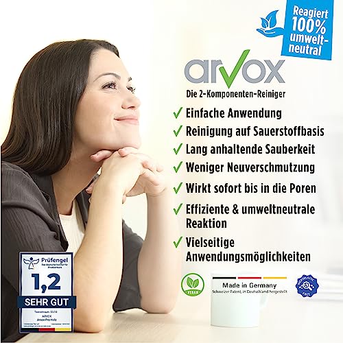 Arvox Pro Holz Spezialreiniger 2 x 2,5 L Set – der ökologische Holzreiniger für Innen- und Außenbereiche. Einfach auf die Fläche aufsprühen, einarbeiten und Verschmutzungen beim Oxidationsprozess eliminieren. Ideal geeignet für Holzoberflächen, Terrassendielen, Gartenmöbel und Holzfassaden. Die Reaktion mit aktivem Sauerstoff, Wasser und Waschsoda sorgt für eine schonende Reinigung, die Verschmutzungen in Poren löst und Neuverschmutzungen vorbeugt. Hergestellt in Deutschland und geprüft durch Prüfengel mit der Gesamtnote 1,2 (Sehr Gut, Stand 03/2023). Das Reinigungsverfahren arbeitet ohne schädliche Rückstände und ermöglicht eine gefahrlose Anwendung sowohl drinnen als auch draußen. Lieferumfang: zwei Kanister à 2,5 Liter der Komponenten A & B (5 L Gesamtinhalt); passende Sprühköpfe und Scheuerbürste separat erhältlich. Mit Arvox wird die Reinigung effizient, umweltneutral und ergebnisorientiert – ohne komplettes Abschleifen, mit Tiefenreinigung bis in die Poren.
