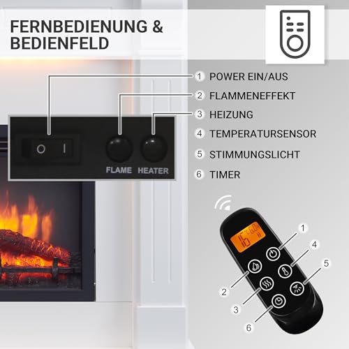 Der BALDERIA Elektrokamin Hikaru bietet ein realistisches Kernerlebnis ohne offenes Feuer. Das 3D-Flammenspiel erzeugt eine natürliche Feuerdarstellung mit Holz- und Glutoptik und sorgt für eine behagliche Atmosphäre in Ihrem Wohnbereich. Die integrierte Elektro-Heizung liefert zusätzlich Wärme und eignet sich als strombetriebene Heizalternative, die auch größere Räume angenehm erwärmt. Optisch überzeugt der Kamin durch seinen weißen MDF-Mantel, der sich harmonisch in klassische wie moderne Einrichtungsstile einfügt. Die Oberfläche ist robust und kratzfest, der Mantel nach Wunsch mit handelsüblicher Farbe überstreichbar. Die Bedienung erfolgt bequem per Fernbedienung oder per App, wobei Basisfunktionen auch direkt am Gerät verfügbar sind. Sicherheit steht im Fokus: Kein Ruß, kein Kohlenmonoxid, Überhitzungsschutz und eine sichere Nutzung für Familien- und Haustierhaushalte.