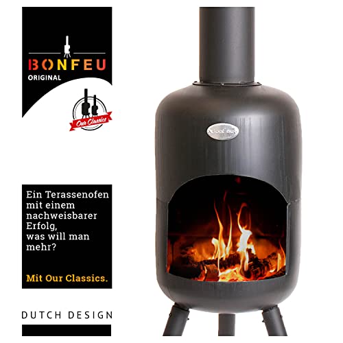 BonFeu BonBini Terrassenofen Schwarz- Kompakter Gartenkamin aus robustem Stahl, Ø 30 cm, H 115 cm- Eleganter Outdoor- Kamin für Garten, Balkon & Terrasse- Inklusive Schürhaken & Deckel