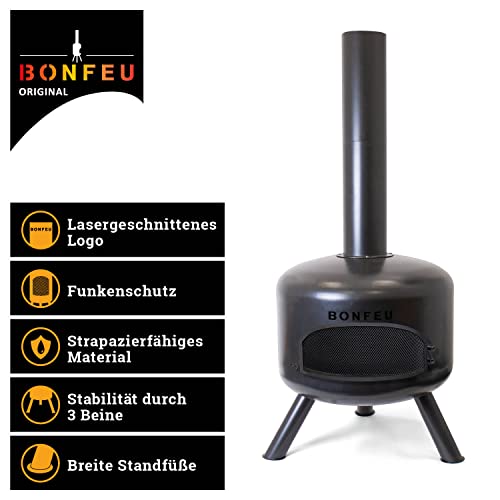 BonFeu BonGiro Schwarz- Terrassenofen- Feuerstelle mit Funkenschutz für entspannte Abende- Feuersäule Outdoor- Terrassenkamin mit Grillrost- Gartenofen aus hochwertigem Cortenstahl, 3559