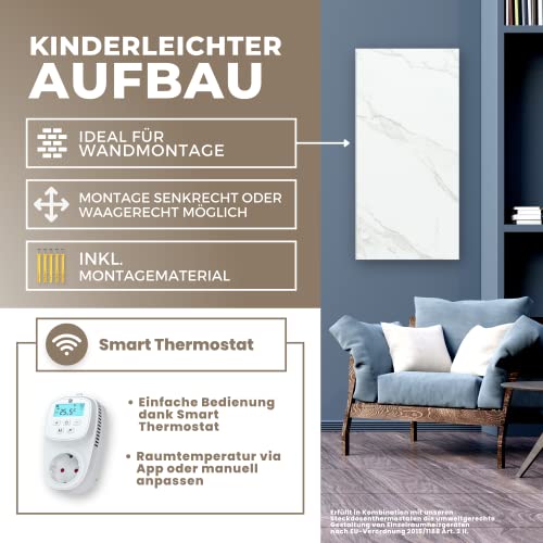 Elegante Keramik-Infrarotheizung in Marmoroptik, 800 W mit Smart Thermostat, WiFi/App-Steuerung und Rückstrahlwanne für effektive Wärme. Leise, montagefreundlich und energiesparend.