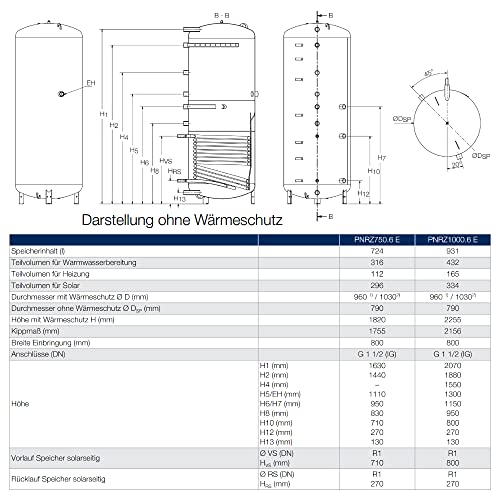 Der Pufferspeicher Buderus Logalux PNRZ1000.6 ES- B mit einem Nutzinhalt von 931 Litern bietet eine zuverlässige Kombination aus Warmwasserspeicher und Solarwärmetauscher. Er ist speziell auf die Einbindung einer Solaranlage ausgelegt und optimal auf Logatherm Wärmepumpen abgestimmt. Das kompakte, silberfarbene Gehäuseprofil fügt sich harmonisch in verschiedene Heiz- und Warmwassersysteme ein und ermöglicht eine effiziente Speicherung sowie bedarfsgerechte Bereitstellung von Warmwasser. Das robuste System unterstützt eine zuverlässige Warmwasserversorgung und trägt damit zu einem komfortablen Heimkomfort bei.