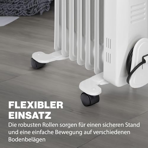 Effiziente mobile Heizung mit 7 Rippen, bis 1500 W, drei Leistungsstufen und stufenlosem Thermostat. Sicher durch Überhitzungsschutz und Kippsicherung. Slimline-Design mit Rollen für einfachen Transport.
