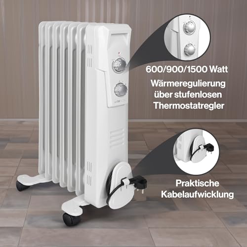 Clatronic Ölradiator | Effiziente mobile Heizung | elektrische Heizung mit 7 Rippen | Radiator mit 3 Leistungsstufen | Slimline Heizkörper | bis zu 30qm | 1500 Watt | RA 3735