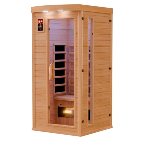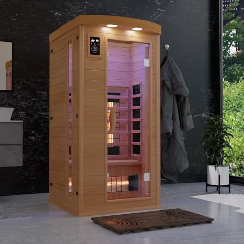 Dewello Infrarotkabine Infrarotsauna Pierson 90×90 für 1 Person aus Hemlock Holz mit Vollspektrumstrahler, Bodenstrahler, LED- Farblicht, Bluetooth, FM, MP3, USB
