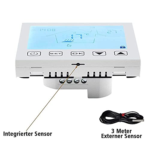 Digital Touchscreen Programmierbar Raumthermostat for Wall Infrarotheizung Electric Fußbodenheizung Elektrisch Regler mit Fühler Thermostat Heizung LCD Display White Wandheizung Sensor16A 230V