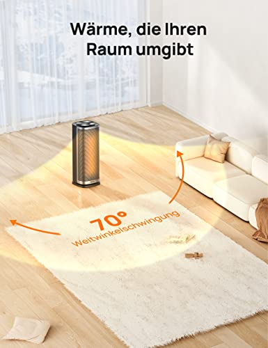 Schnelle, energiesparende Wärme mit keramischem Heizkern, 70°-Oszillation, 3 Modi und ECO-Modus. Stiller Betrieb, Sicherheits-Features und Fernbedienung für bequemen Einsatz.