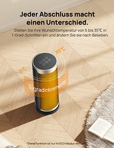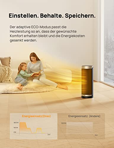 Der Dreo Space Heater bietet gezielte Wärme für Innenräume wie Büro, Schlafzimmer oder Wohnbereich. Mit 70° Weitwinkel-Oszillation verteilt sich warme Luft gleichmäßig, während das exklusive Trackball-System sanfte, ruhige Bewegungen der Heizabdeckung ermöglicht. Ein leiser Betrieb (ca. 40 dB) sorgt für entspannte Arbeits- und Schlafmomente, ohne von Geräuschen gestört zu werden. Die integrierten Sicherheitsfeatures umfassen Kippschutz, Überhitzungsschutz, 12-Stunden-Timer und eine automatische Abschaltung nach 24 Stunden, ergänzt durch einen robusten, 1,80 m langen Eurostecker und ein flaches Netzkabel. Die ECO-Funktion passt die Heizleistung automatisch an die Umgebungstemperatur an, mit einem Leistungsbereich von 900 W bis 1800 W. Das kompakte Gehäuse (40 cm) inklusive verstecktem Griff erleichtert die Mobilität im Haushalt. Fernbedienung und Touchscreen gewährleisten bequeme Steuerung aus dem Raum oder aus größerer Entfernung bis 8 Metern.