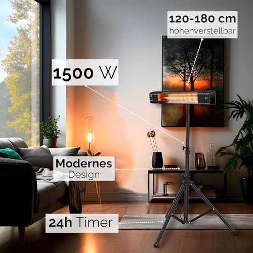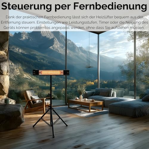 Sofortige, gezielte Wärme durch 3 Leistungsstufen (500/1000/1500 W) mit Display, Fernbedienung und 24h-Timer. Spritzwasserschutz IP20, Überhitzungsschutz, verstellbare Höhe und Neigung. Inklusive Wand-/Deckenmontage-Material.