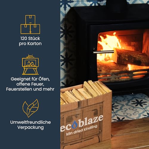 EcoBlaze Anzündholz – Ofengetrocknetes Anzündholz für Holzöfen, Kaminöfen, Pizzaöfen und Grills. Vielseitig im Haus, Garten, beim Camping oder Glamping einsetzbar und perfekt geeignet für den schnellen, sauberen Holzbrand in Holzöfen, Feuerstellen, Öfen, Pizzaöfen und Chimeneas. Das Anzündholz ist ready-to-burn zertifiziert: Der Feuchtigkeitsgehalt liegt unter 20 %, sodass das Anzünden eines gesunden Feuers schnell gelingt. Jede Kartonage wird von Hand verpackt, um Qualität sicherzustellen, und ausschließlich umweltfreundliche Verpackungen kommen zum Einsatz. Die praktische, kompakte Verpackung erleichtert die Aufbewahrung zu Hause oder unterwegs. Eine Megapackung umfasst in der Regel 120 Stück ofengetrocknetes Kleinholz, sodass lange Feuerphasen gewährleistet sind, bevor eine Nachbestellung nötig wird.
