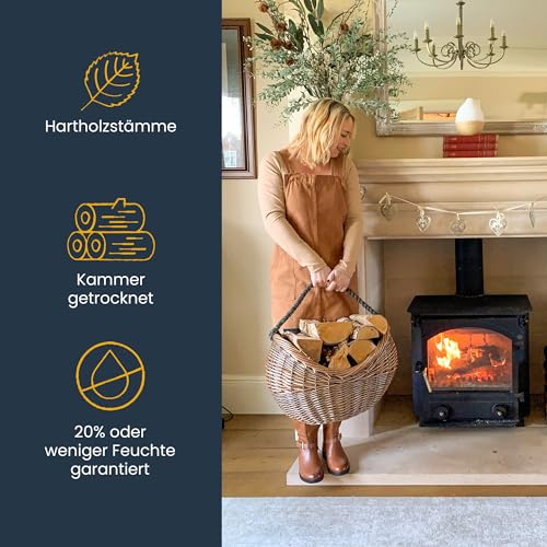 Hartholzscheite, geschnitten, gespalten und ofengetrocknet, garantiert <=20% Feuchtigkeit. Perfekt für Öfen, Feuerstellen, Kamine und Lagerfeuer – handverpackt in umweltfreundliche Kartons.