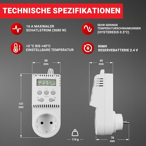 Der ELEKTROBOCK TS10 Steckdosen- Thermostat sorgt für präzise Temperatursteuerung dort, wo Sie Wärme planen. An der Steckdose angeschlossen, lässt sich der Betrieb von Heizungssowie Infrarotmodulen zeitlich exakt programmieren: Bis zu vier Heiz- und Sparzeiten pro Tag sowie individuelle Wochenprogramme für Montag bis Sonntag, Werktage, Wochenende oder jeden Tag. So optimieren Sie Raumklima und Energieverbrauch gleichzeitig. Dank intelligenter Funktionen reduziert der TS10 unnötigen Energieverbrauch: Er erfasst automatisch geöffneten Fenster und passt die Heizleistung entsprechend an, um Verschwendung zu vermeiden. Eine Frostschutzfunktion sorgt dafür, dass Ihre Heizung auch bei niedrigen Temperaturen aktiviert bleibt. Die Temperatur lässt sich in feinen 0,5-Grad-Schritten zwischen +3°C und +40°C einstellen und erreicht bei 230 V eine maximale Last von 16 A bzw. 3680 W. Die integrierte EEPROM-Speicherfunktion verhindert Datenverlust bei Stromausfällen und hält Ihre Programmierung zuverlässig fest. Hergestellt in der EU und mit deutscher Gebrauchsanweisung ausgestattet, gewährleistet der TS10 einfache Installation und zuverlässige Betriebsqualität.