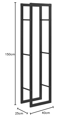 [en.casa] Kaminholzregal 40x150x25cm Brennholzregal Feuerholzregal Holzhalter – robustes, pulverbeschichtetes Stahlregal zur ordentlichen Lagerung von Brennholz. Dank der stabilen Konstruktion sorgt das Regal für eine saubere Aufbewahrung und schützt das Kaminholz vor Bodenfeuchtigkeit. Geeignet für Innen- und Außenbereich, sodass Sie Feuerholz flexibel dort platzieren können, wo es benötigt wird. Die schwarze Pulverbeschichtung bietet gute Witterungsbeständigkeit und eine zeitlose Optik, die sich harmonisch in verschiedene Einrichtungskonzepte einfügt. Abmessungen Gesamtmaß L x H x B: 40 x 150 x 25 cm; Rahmenmaße B x T: 4 x 2 cm. Markenware aus dem Hause en.casa.