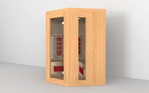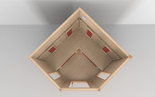 Elegante Infrarotkabine für 4 Personen (150 × 150 × 190 cm) mit robuster Elementbauweise, schneller Aufheizung und hochwertiger nordischer Fichte – ideal als moderne Alternative zur klassischen Sauna.