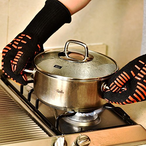 Hitzebeständige Grillhandschuhe bis 932°F (500°C) mit Baumwollinnenfutter, Nomex/Kevlar-Fasern und maschinenwaschbar. Schützt Hände beim Grillen, Backen, Ofen und Kamin – einfach anzuziehen und flexibel einsetzbar.