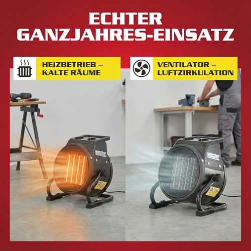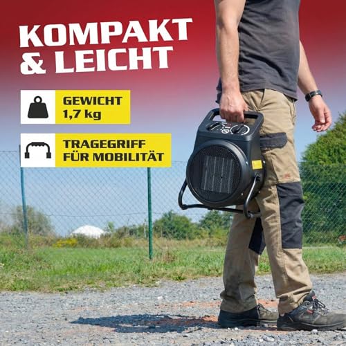 Schnell en Wärme dank 3 kW Leistung, drei Stufen, Thermostat, Überhitzungsschutz und leisem Betrieb – flexibel einsetzbar in Wohnräumen, Bad, Büro oder Camping.