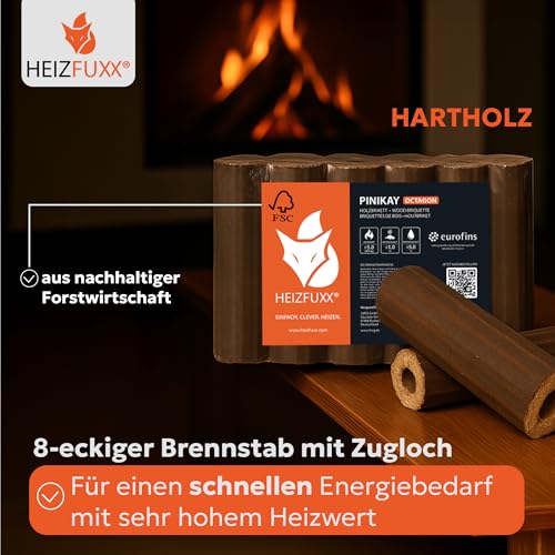 HEIZFUXX Holzbriketts PiniKay Octagon – hochwertige Hartholzbriketts liefern gleichmäßig hohe Wärme bei geringem Aschegehalt. Die Briketts sind schnell entzündbar und eignen sich ideal für Kamin, Heizkessel und Ofen. Dank der oktogonalen Form und dem integrierten Zugloch lassen sich die Briketts sicher und leicht anzünden sowie sauber platzieren. Die Palette mit insgesamt 960 kg (96 Stück à 10 kg) bietet eine langfristige Brennstoffversorgung für kühle Abende und kalte Jahreszeiten. Die Brennstoffeigenschaften unterstützen einen effizienten Wärmekomfort und tragen zu einer angenehmen Raumtemperatur bei.