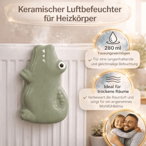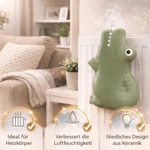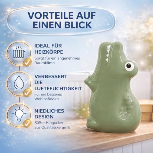 Schluss mit trockener Luft – besonders in der kalten Jahreszeit belastet Heizluft das Raumklima. Das 6-teilige Set aus hochwertiger Keramik bietet eine kostengünstige und umweltschonende Lösung: Die handbemalten, glänzend glasierten Verdunster mit Tiermotiven, darunter Krokodile, sorgen durch Verdunstung für eine angenehme Luftfeuchtigkeit. Die Füllmenge beträgt 220 ml pro Stück, sodass sich der Feuchtehaushalt gezielt regulieren lässt. Die kompakte Höhe von 15,7 cm (ohne Haken), Breite 10,5 cm und Tiefe 4,3 cm ermöglichen den Einsatz auch an Rippen- sowie anderen Heizkörpern. Hinweis: Die glasierte Oberfläche kann kleine Glasurfehler aufweisen, diese sind Produktionsbedingt und beeinträchtigen nicht die Funktion.