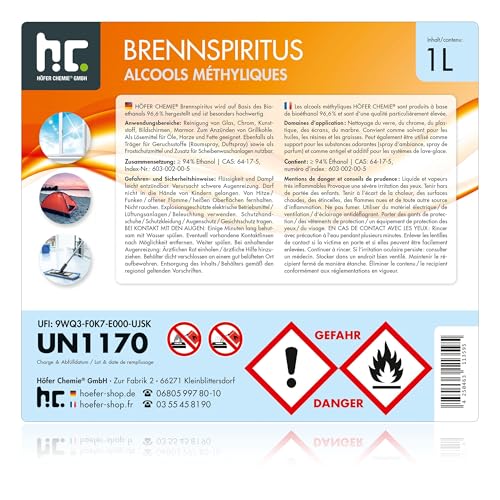 Höfer Chemie Brennspiritus 94% im 6er-Pack ohne Weichmacher. Streifenfreie Fenster, entfettende Wirkung auf Glas, Chrom, Kunststoff und Displays. Auch als Scheiben-Frostschutzmittel bewährt.
