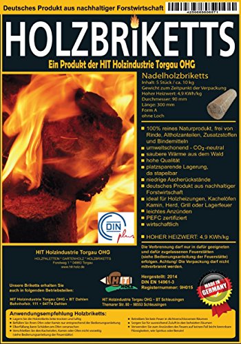 Nadelholzbriketts mit 4,9 kWh/kg Heizwert, Durchmesser 90 mm, Länge 300 mm, Form A ohne Loch. Folienpackung 5 Stück (~10 kg); Lieferung auf Europalette inklusive.