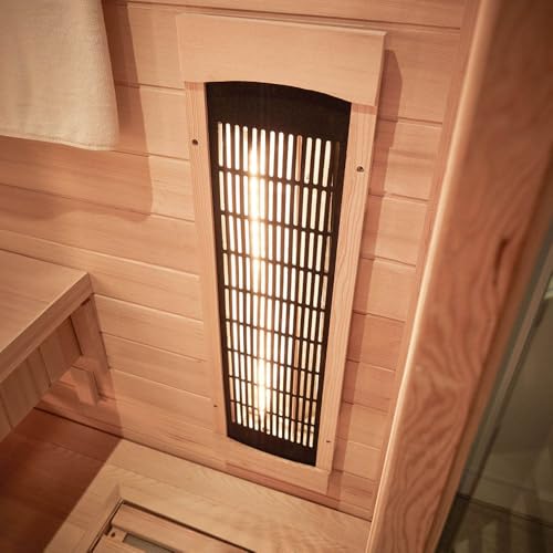 Sitzsauna für 2 Personen aus Hemlock-Tannenholz mit 5 Vollspektrumstrahlern, 230 V Anschluss, schnelle Erwärmung bis 60 °C, farbwechselnde LED-Beleuchtung.