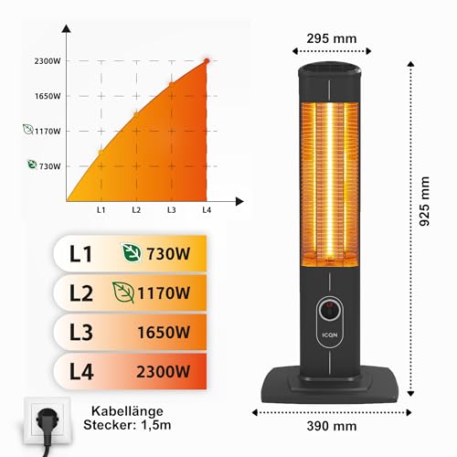 Der ICQN 2300 W Standheizstrahler bietet eine leistungsstarke Infrarot-Wärme für Innen- und Außenbereiche. Mit insgesamt vier Heizstufen von 730, 1170, 1650 und 2300 Watt lässt sich die Wärme präzise anpassen und sorgt auf Terrassen, Balkonen, Wintergärten oder Garage zuverlässig für behagliche Temperaturen. Die Carbon-Infrarottechnik wandelt bis zu 90% der elektrischen Energie in Wärme um, wodurch sich Wärme direkt auf Personen projiziert, ohne die Raumluft zu erhitzen. Die Bedienung erfolgt bequem per Fernbedienung; ein digitales Thermostat, eine Sleep-Timer-Funktion und ein LCD-Display unterstützen komfortables, energiesparendes Heizen. Sicherheit steht im Fokus: Ein Umkippschutz reagiert auf Neigung, der Überhitzungsschutz schaltet den Strahler bei Bedarf automatisch ab. Die Abstrahlung erfolgt flexibel aus drei Winkeln, damit die Wärme optimal verteilt wird und eine Heizfläche von ca. 20 m² erreicht wird. Der robuste Standfuß ermöglicht sicheren Stand auch im Freien und macht den Heizer zur praktischen Lösung für Terrasse, Balkon, Wintergarten, Keller oder Garage.