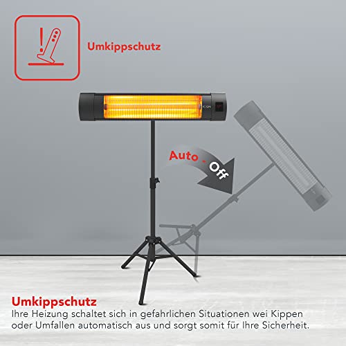 Vielseitiger Infrarot-Heizstrahler mit höhenverstellbarem Dreibeinstativ, wand-/deckenmontage oder freistehend. 4 Stufen (900–2300 W) sorgen für schnelle Wärme auf bis zu 23 m². Fernbedienung, Befestigungskit, IP20-Schutz.