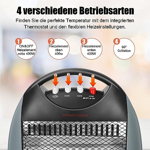 Infrarot Heizstrahler Elektrisch 3- Heizstufen 400/ 800/ 1200 Watt Quarz Halogen Stand- Heizstahler Mobiles Elektrische Heizung Energiesparend Leise für Büro Wohnzimmer (70° Oszillierend), Grau (Grau)