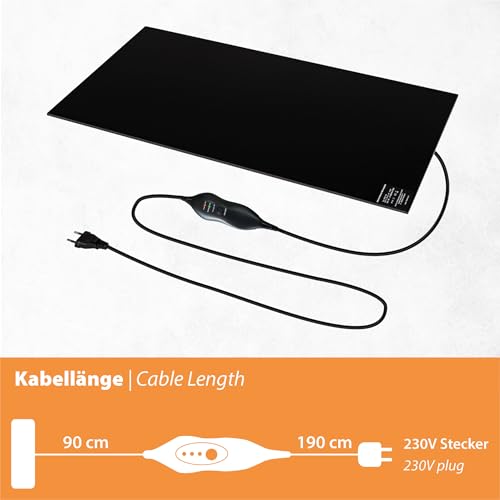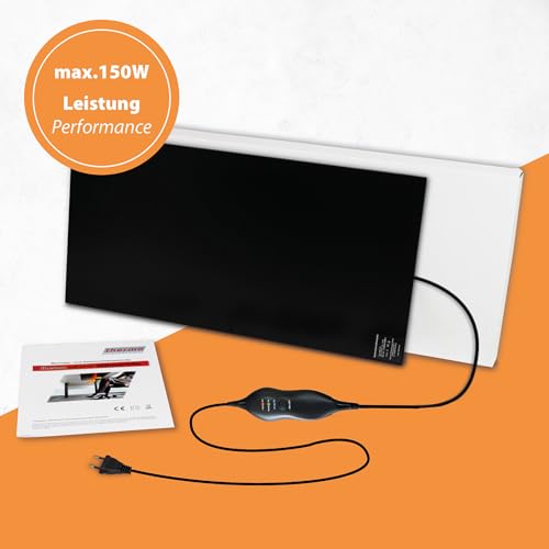 150 W Infrarot-Wärmeplatte mit Drehdimmer zur stufenlosen Temperaturregelung und Ein-Aus-Schalter. Selbstklebende Rückseite für Montage unter Schreibtisch oder Kasse. Angenehme Strahlungswärme wärmt Füße und Beine gleichmäßig, ideal auch für Allergiker.