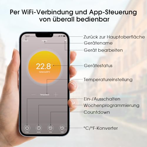 Die Infrarotheizung Standgerät mit 580 Watt bietet flexible Wärme für kleine bis mittelgroße Räume. Dank App-Steuerung und Fernbedienung lässt sich die Temperatur bequem aus dem Wohnbereich heraus regulieren, während das integrierte Thermostat für konstante Werte sorgt. Mobil einsetzbar, lässt sich das Standgerät jederzeit an einen gewünschten Ort verschieben oder wandmontieren, je nach Bedarf. Die leise Betriebsweise sorgt dafür, dass Sie ungestört arbeiten oder sich entspannen können. Wartungsfrei und energieeffizienter als herkömmliche Elektroheizungen, bietet dieses Modell eine wirtschaftliche Heizlösung. Empfohlen wird ein Heizbereich von etwa 6–8 m²; es lässt sich zudem als zusätzliche Heizung für größere Räume nutzen. Das stabile Standgerät verfügt über Rollen und Standfüße sowie Sicherheitsmechanismen wie Überhitzungsschutz.