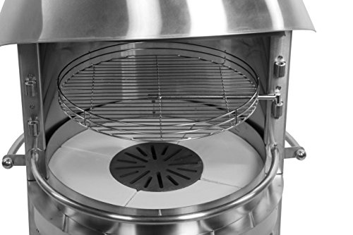 Hitzebeständiger, rostfreier Stahl bis 600° C. Ascheschublade für einfache Reinigung. Mobil dank vier Rollen. Griffe aus Edelstahl. Grillkamin 62 x 65 x 226 cm; Grillrost Ø 45 cm.