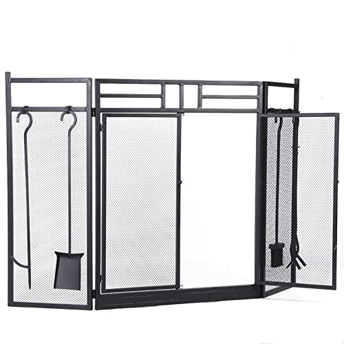 Verstellbarer Kaminschutz mit 3 Paneelen aus Schmiedeeisen, robust beschichtet. Klappbar, drehbar bis 180°, passend für verschiedene Öffnungen. Enthält 4 streckbare Kaminwerkzeuge und bietet sichere Abgrenzung von Glut.
