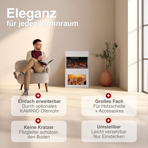 KAMINIO Elektrokamin Henri- Elektrischer Kaminofen mit Heizung, 3D- Flammeneffekt, Holzfach, LED- Ambientelicht, Fernbedienung (Weiß)