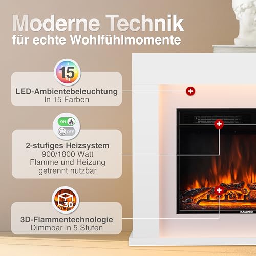 Der KAMINIO Elektrokamin Matti ist ein eleganter Standkamin, der Wohnräume sofort mit einer stimmungsvollen Feuersimulation aufwertet. Die innovative 3D-Flammentechnologie erzeugt ein realistisches Flammenbild, ergänzt durch eine LED-Ambientebeleuchtung in 15 Farben, die sich sanft an das Ambiente anpasst. Dank eines leistungsstarken, aber sparsamen Heizsystems mit zwei Heizstufen erwärmt der Kamin Räume zuverlässig und leise (ca. 50 dB). Das pflegeleichte Gehäusematerial überzeugt durch hochwertige Optik und lässt sich unkompliziert in jedes Raumkonzept integrieren. Plug & Play: Steckdose genügt – kein Elektriker, keine Genehmigungen nötig. Die Bedienung erfolgt bequem per Fernbedienung. Zusätzlich sorgt der integrierte Überhitzungsschutz sowie eine Offen-Fenster-Erkennung für maximale Sicherheit.
