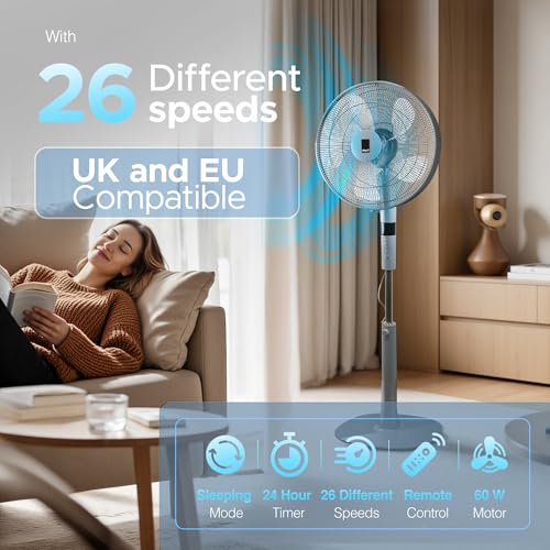 Der KEPLIN Standventilator sorgt für eine angenehme Brise in Wohn- und Arbeitsräumen. Dank verstellbarer Höhe von 1150 mm bis 1350 mm passt er sich flexibel an, sodass der Luftstrom immer komfortabel zu spüren ist. Mit 10 Flügeln liefert er eine leistungsstarke Turbo-Windgeschwindigkeit für effiziente Kühlung und schnelle Abkühlung an heißen Tagen. Die Fernbedienung ermöglicht die Steuerung aller Funktionen bequem vom Sitzplatz aus, während das LED-Display die gewählten Einstellungen übersichtlich anzeigt. Wählen Sie aus 26 Lüftergeschwindigkeiten, drei Modusoptionen (normal, natürlich, Schlaf) und einer 90-Grad-Oszillation, um die Abdeckung und den Luftstrom optimal zu gestalten. Zusätzlich sorgt die 24-Stunden-Zeitschaltuhr für energiesparende Nutzung. Die Oberfläche aus hochwertigem Kunststoff verleiht dem Gerät eine moderne Optik, und das 1,6 m lange Kabel ermöglicht flexible Platzierung. Mit 60 W Leistung und einem stabilen Stand bietet der Keplin Standventilator zuverlässige Kühlung im Schlafzimmer, Wohnzimmer oder Büro. Sicherheit und Zuverlässigkeit stehen im Vordergrund, damit Sie sich auf eine angenehme Raumkühlung verlassen können.