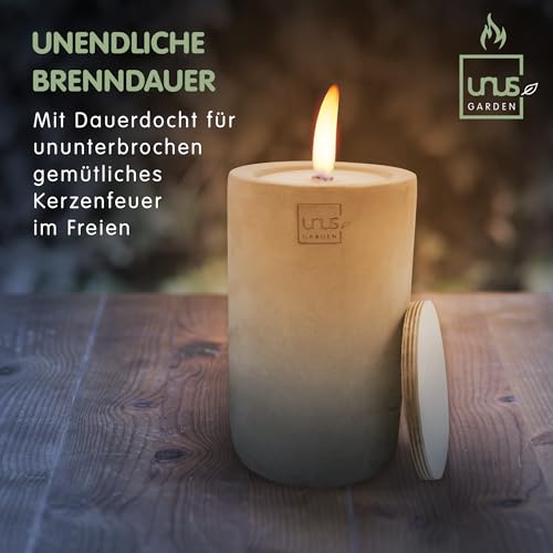 Handgemachte Betonkerze im zylinderförmigen Design für Outdoor-Bereich. Dauerdocht, wetterfest, mit Nachfüllwachs, Löffel und Löschbrett – kompakt als Komplett-Set.