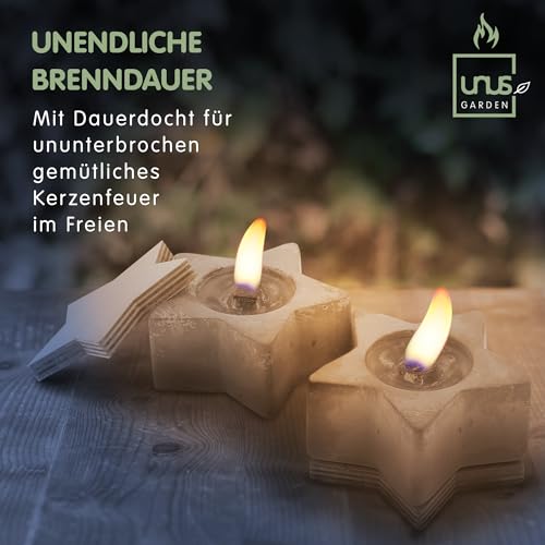 Zwei sternförmige Betonkerzen im Grau-Design mit Dauerdocht. Outdoor-tauglich, wetterfest, inkl. 100 g Nachfüllwachs, Löschbretter und Löffel – für dauerhaft gemütliche Außenmomente.