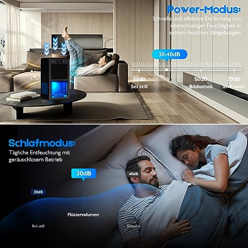 Der Kiumo Luftentfeuchter sorgt in kleinen Räumen wie Schlafzimmer, Badezimmer oder Arbeitszimmer zuverlässig für ein angenehmes Raumklima. Mit einer Entfeuchtungsleistung von bis zu 1000 ml pro Tag unter Idealbedingungen (30°C, 90% relative Luftfeuchtigkeit) wird Feuchtigkeit effizient reduziert und die Luftqualität allgemein verbessert. Zwei Betriebsmodi passen sich unterschiedlichen Nutzungsbedürfnissen an: Der Hochgeschwindigkeitsmodus entfernt Feuchtigkeit rasch, im Schlafmodus arbeitet das Gerät besonders leise mit rund 30 Dezibel und ermöglicht ruhiges Schlafen. Der transparente Wassertank ermöglicht eine klare Sicht auf den Stand der Wasseransammlung und verhindert ein Überlaufen. Zusätzlich bietet das Gerät eine 7-Farben-Umgebungsbeleuchtung, deren Farben sich individuell einstellen lassen, um eine angenehme Atmosphäre zu schaffen. Dank kompakter Abmessungen eignet sich der Luftentfeuchter auch für Küchen, Arbeitszimmer und andere kleine Räume. Das Produkt ist somit ideal, um Feuchtigkeit zu kontrollieren, das Raumklima zu verbessern und ein gesundes, komfortables Umfeld zu schaffen.