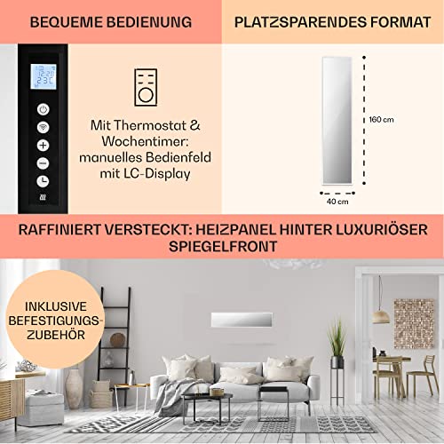 Effiziente Infrarotheizung mit Thermostat, App-Steuerung und Offener-Fenster-Erkennung. Spiegel-Design, platzsparend, IP24 geschützt – flexibel im Haushalt einsetzbar.