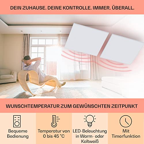 Klarstein Wondersky Infrarotheizung Deckenmontage- Infrarot Heizpaneel mit Wochentimer, Deckenheizung mit Themostat, Beleuchtung, weiß